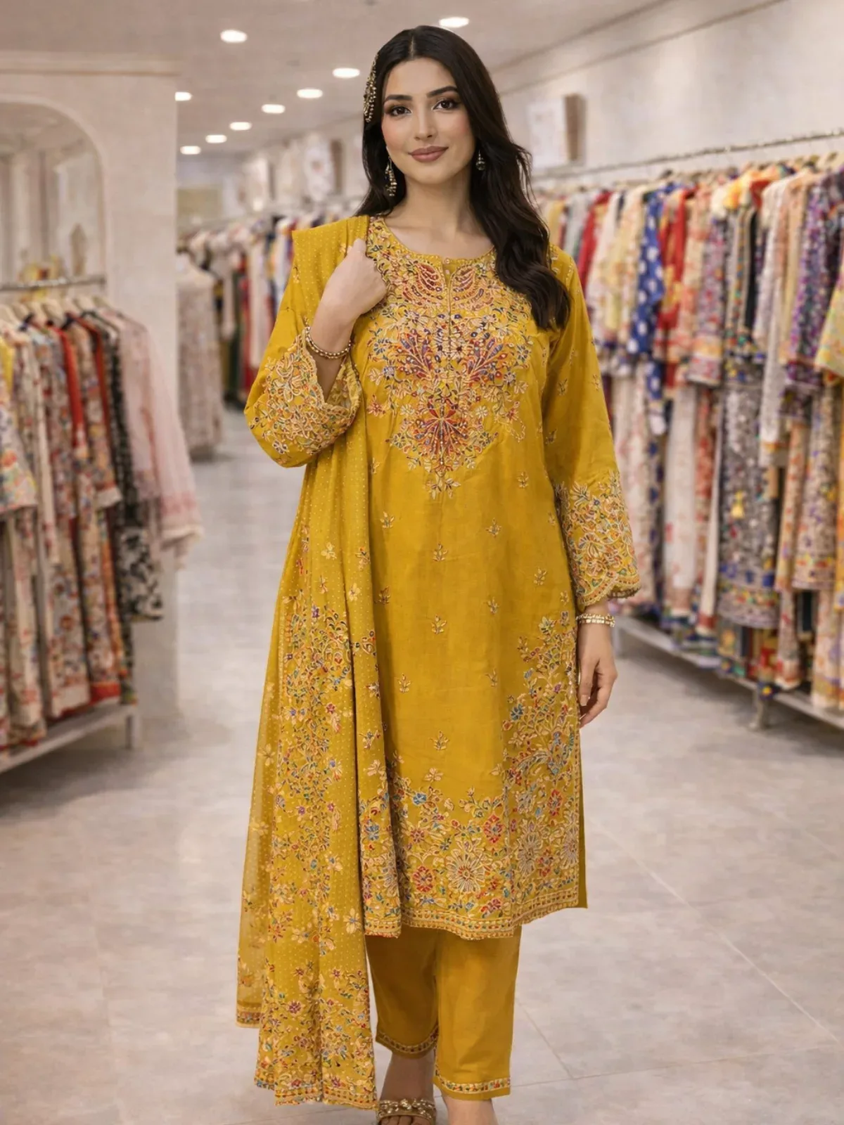 Embrace effortless elegance with the Zarmina Gul Desi Casual Wear, a refined 3-piece embroidered set designed for everyday wear with a traditional touch. Featuring a warm mustard shade and delicate floral embroidery, this outfit is perfect for casual gatherings, daytime events, and comfortable daily styling.